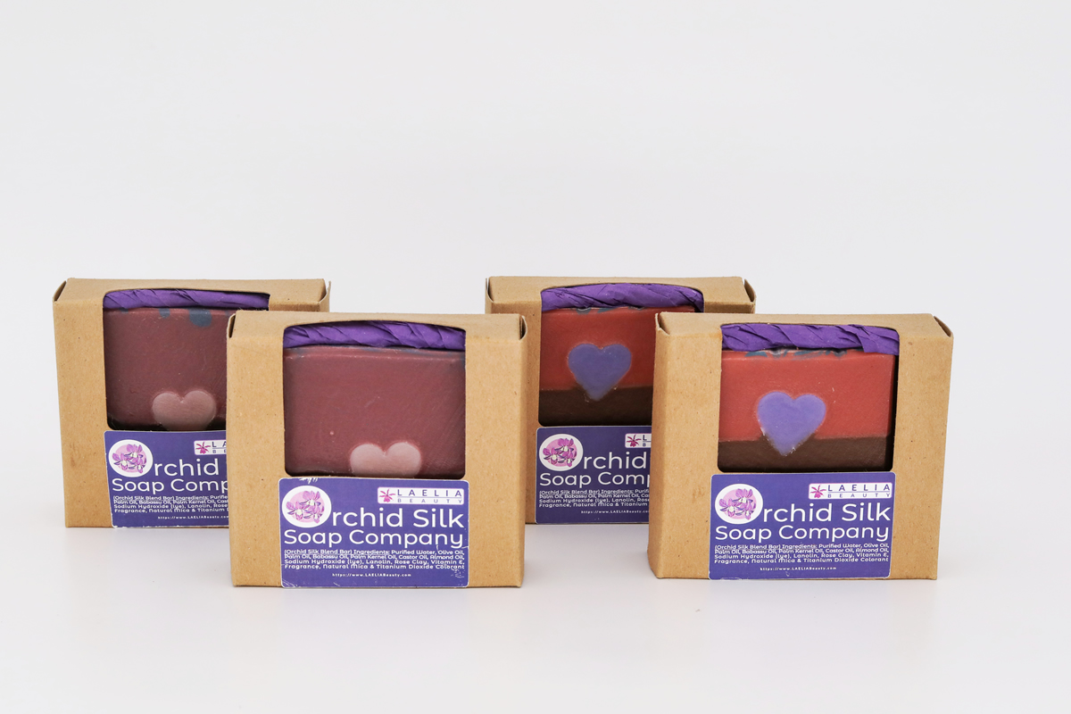 | Our signature bar, made with true floral essentials and the amazing 7-scent "Cabana Boy" pine-tar layer. Pink Victorian Rose with Lavender hearts, and vice-versa. Get 'em while they are hot~ |
